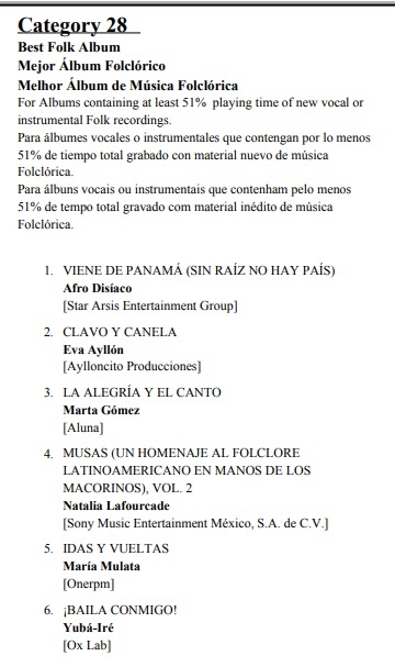 Mientras que Afrodisiaco, están nominados en la categoría Mejor Álbum Folclórico, con VIENE DE PANAMÁ (SIN RAÍZ NO HAY PAÍS).