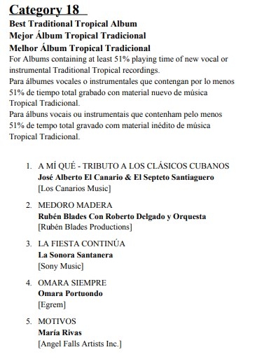 Rubén Blades y Roberto Delgado y orquesta, se encuentran nominados a la categoría Mejor Álbum Tropical Tradicional con su disco MEDORO MADERA.