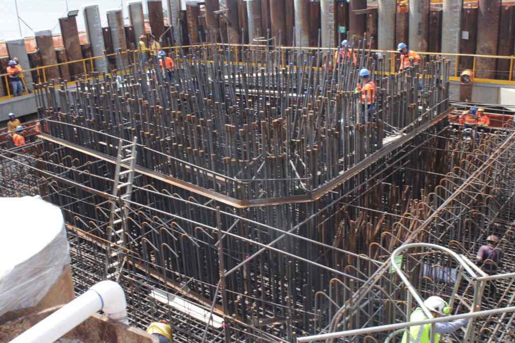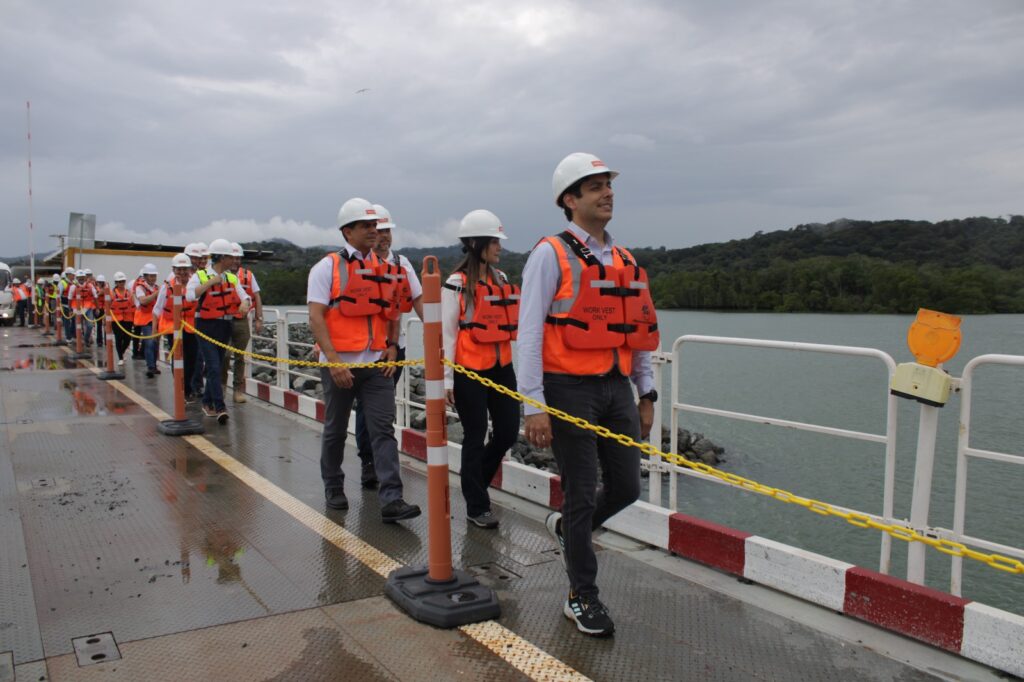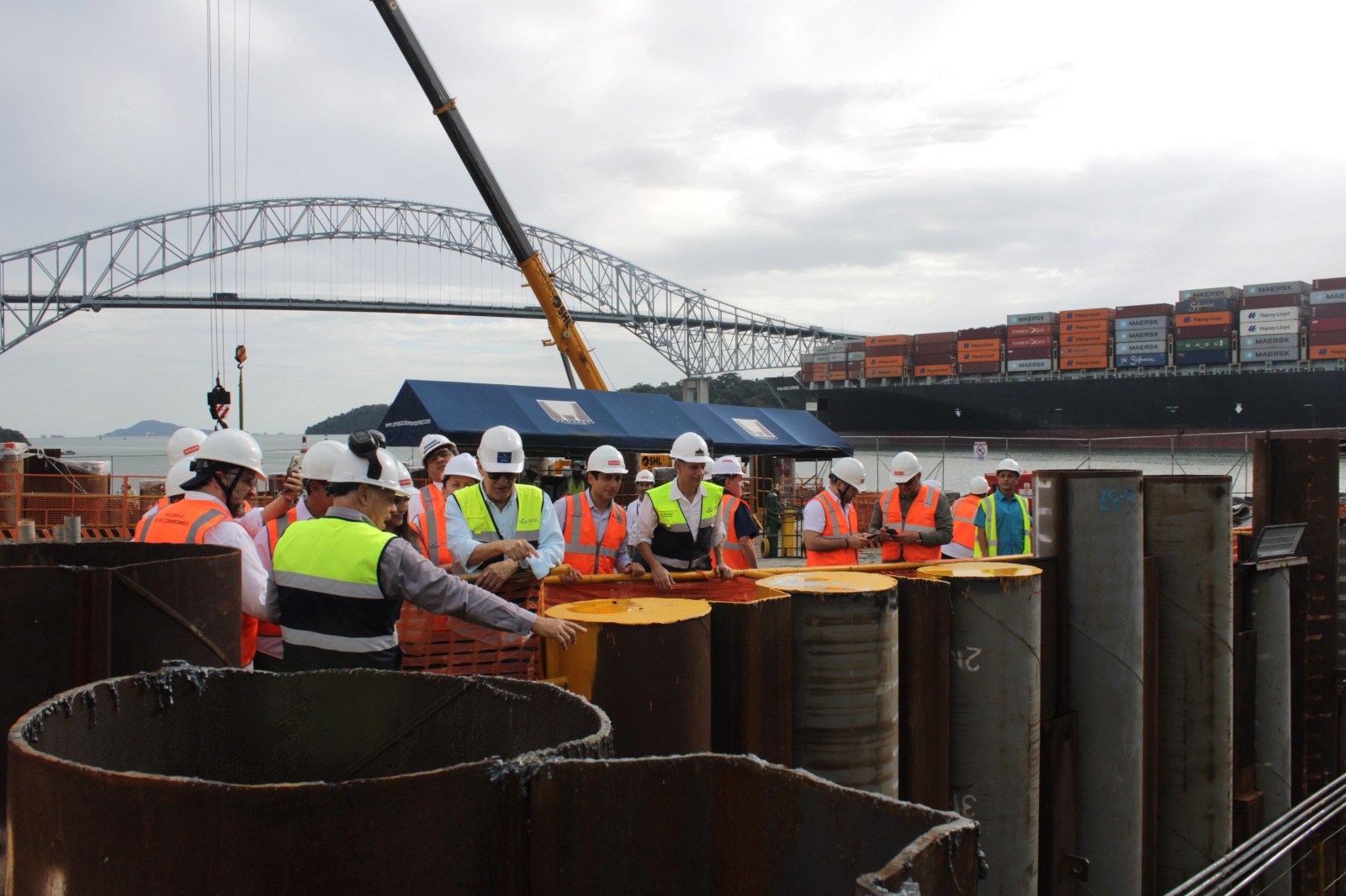 La primera parada fue el relleno de acceso del lado oeste, el cual se conecta con una plataforma de acero donde se construye la torre M4, ubicada en el mar y próxima al cauce de navegación del Canal de Panamá.