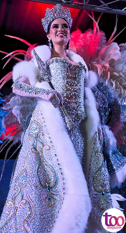 Calle Arriba de Las Tablas celebró la coronación de su septuagésima soberana, S.R.M. Almendra Sofía Crovari Correa, quien deslumbró con un elegante vestido en tonos plateado y blanco, una obra magistral del diseñador Róyer Pérez.