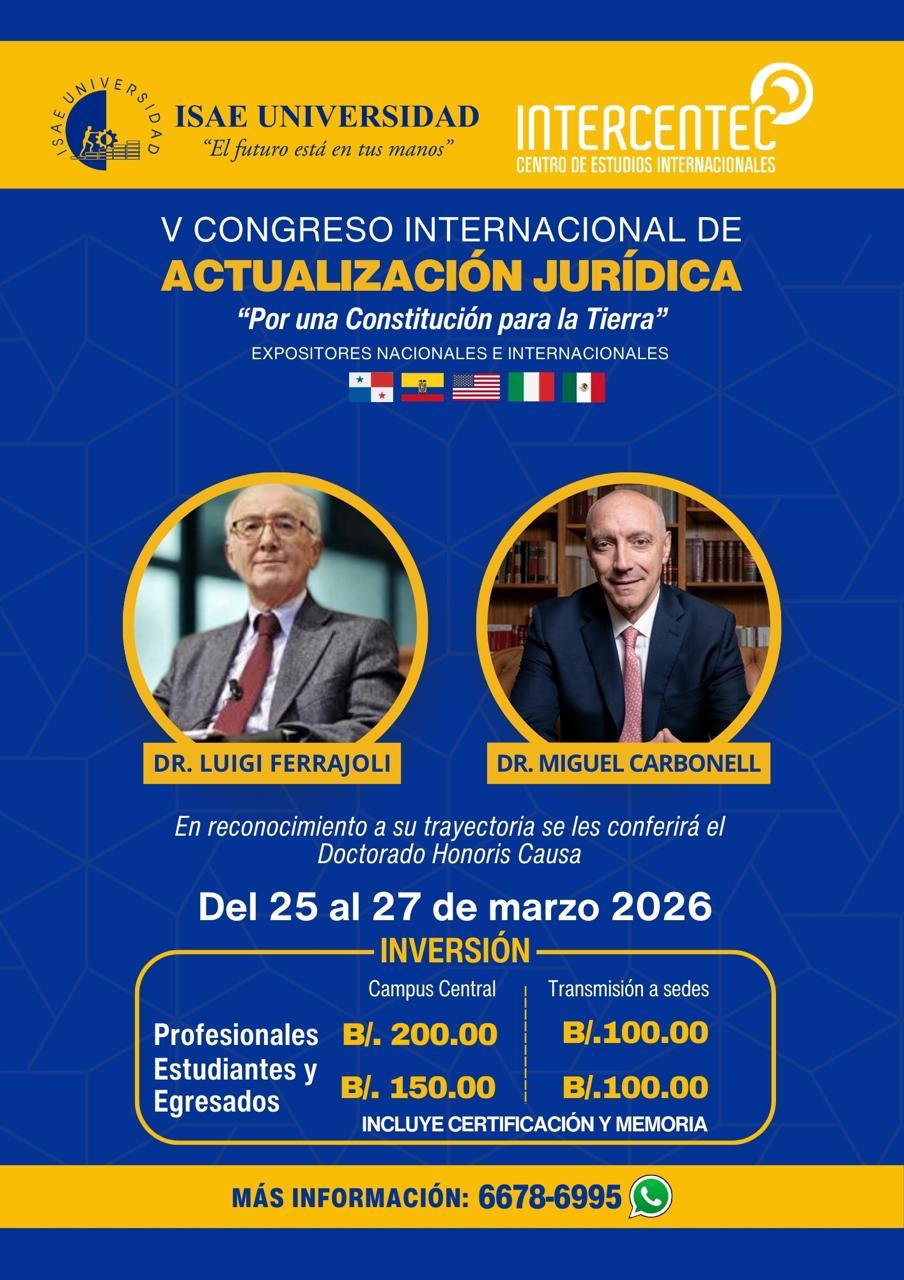 ISAE Universidad en colaboración con el Centro de Estudios Internacionales INTERCENTEC, invitan al V Congreso Internacional de Actualización Jurídica, con proyección internacional latinoamericana, del 25 al 27 de marzo de 2026, en la Ciudad de Panamá.